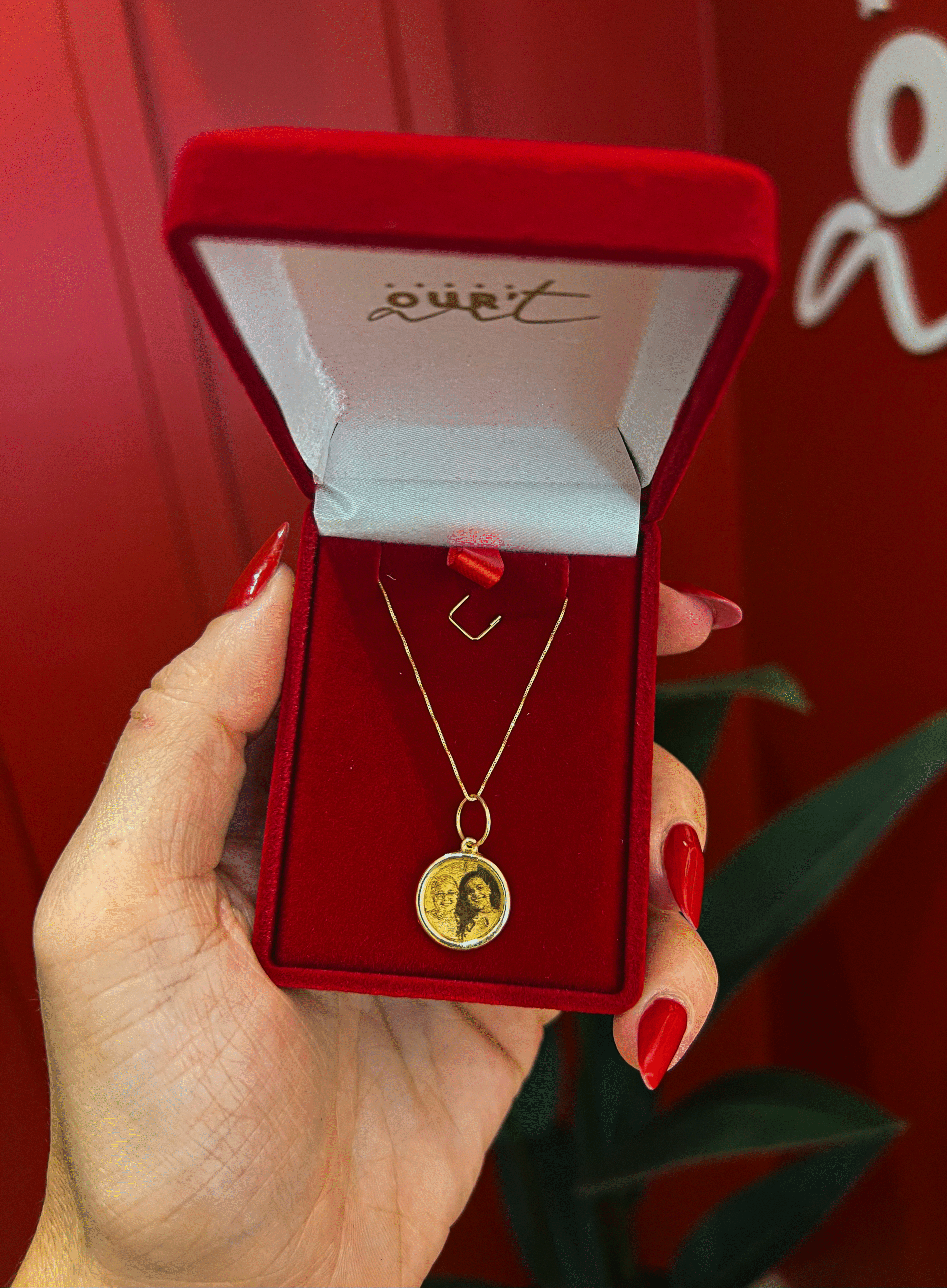 Uma gravação exclusiva com foto, feita em ouro 18k para usar em colar ou pulseira. Mais que uma joia: a prova de um amor eterno, que atravessa gerações.